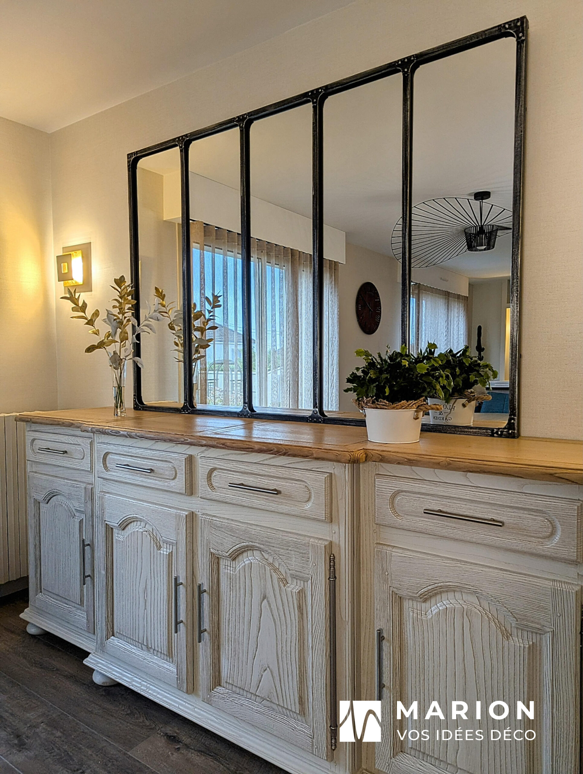 La Signature Éco-responsable : Le Relooking du Buffet La pièce maîtresse de ce projet est sans doute la transformation du buffet familial en merisier. Plutôt que de s’en séparer, nous avons opté pour un relooking sur-mesure. Grâce à une technique de céruse blanche, le bois foncé et massif a laissé place à un meuble lumineux, laissant apparaître son veinage noble. Ce buffet conserve son histoire tout en s’intégrant parfaitement dans la nouvelle décoration contemporaine.