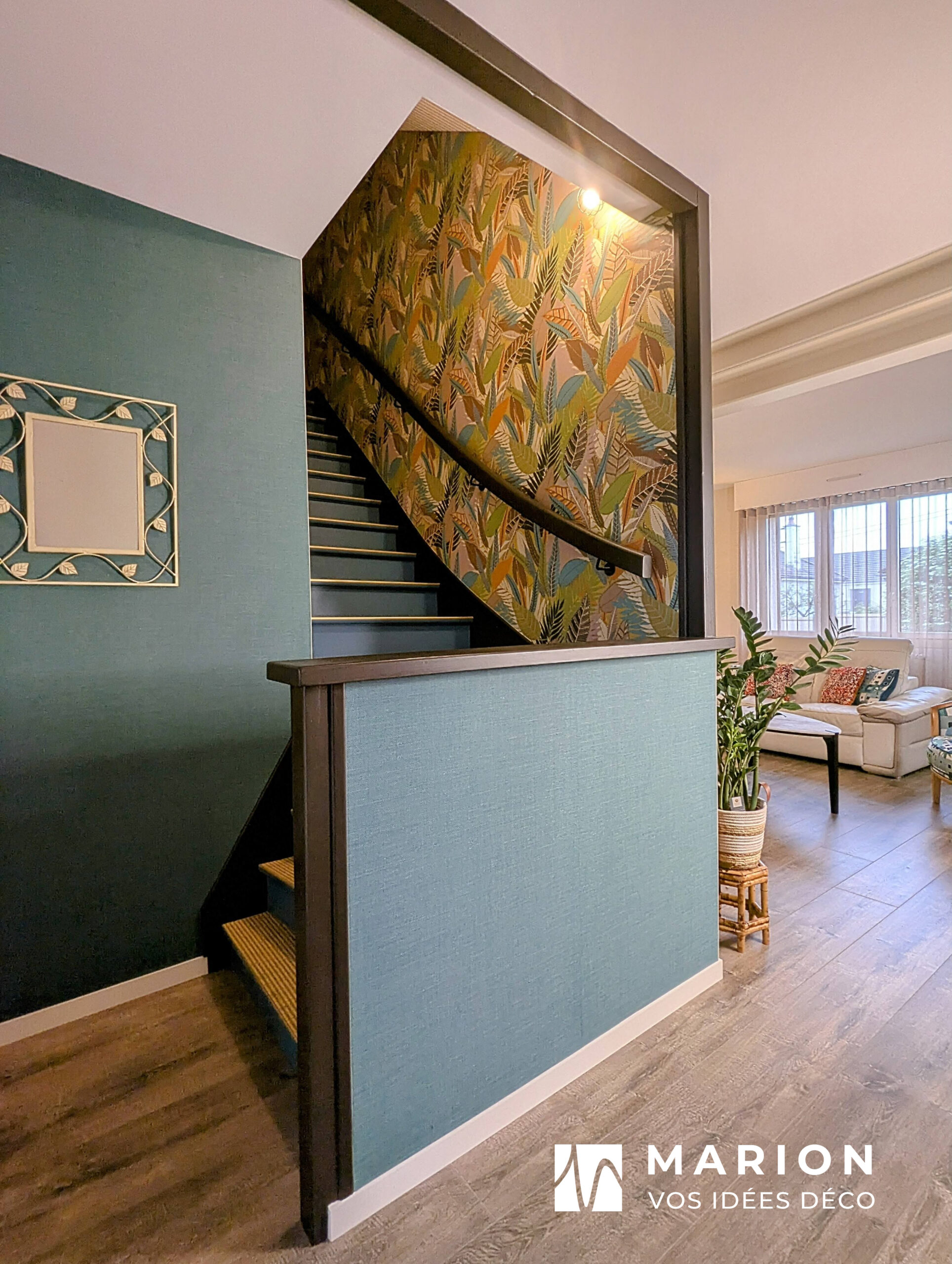 • L’Ambiance : Un papier peint au motif feuillage apporte une touche végétale immédiate, transformant ce lieu de passage en un espace accueillant et lumineux.